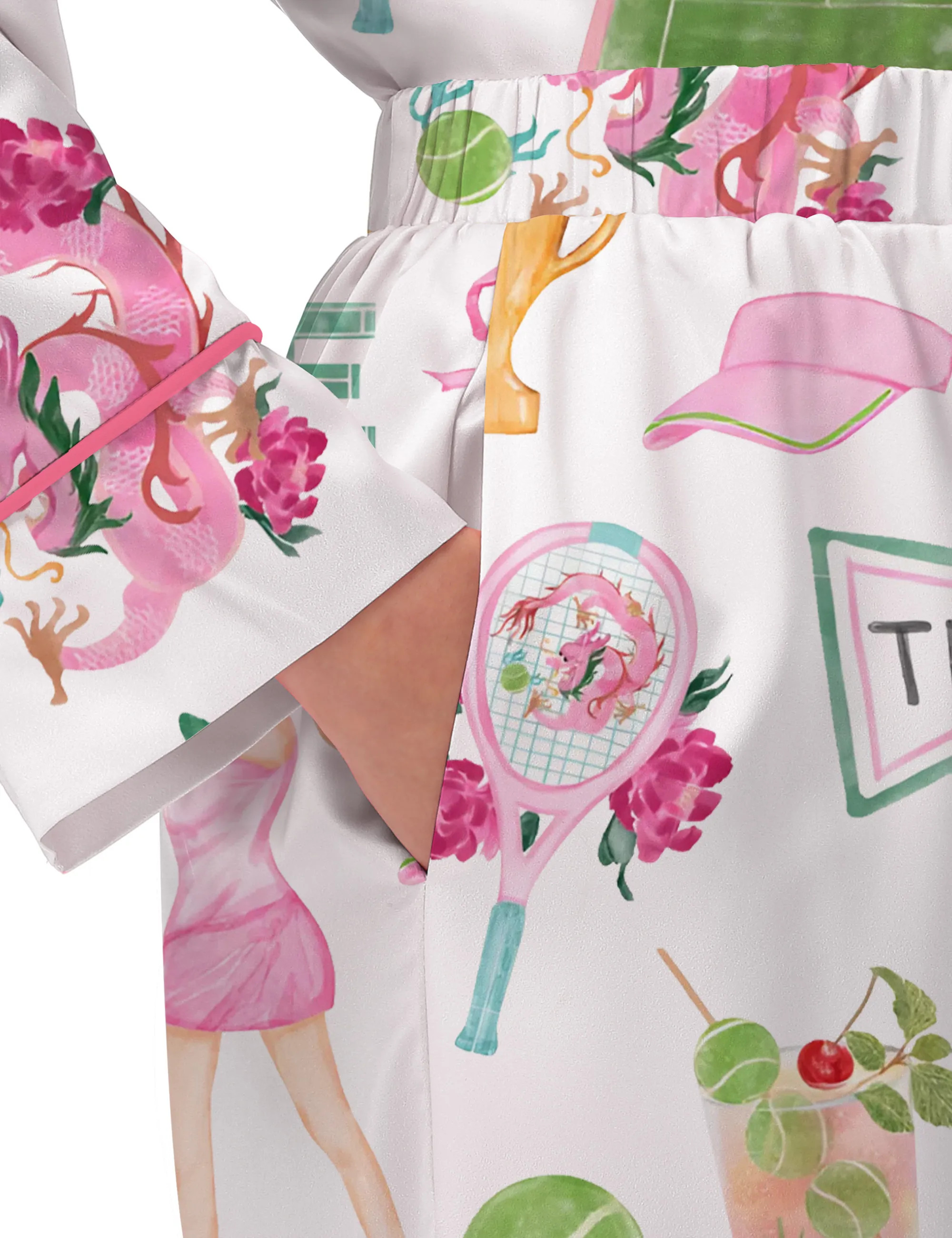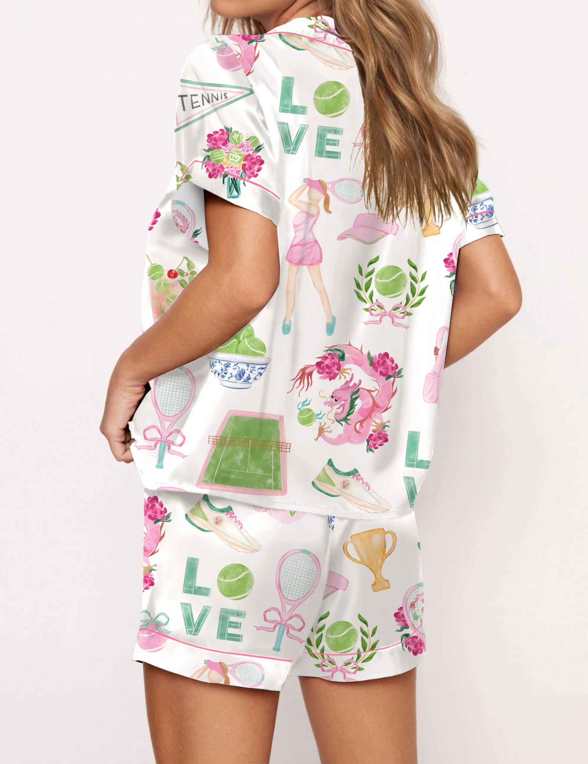 Chinoiserie Tennis Silky Satin Pajama Set For Women
